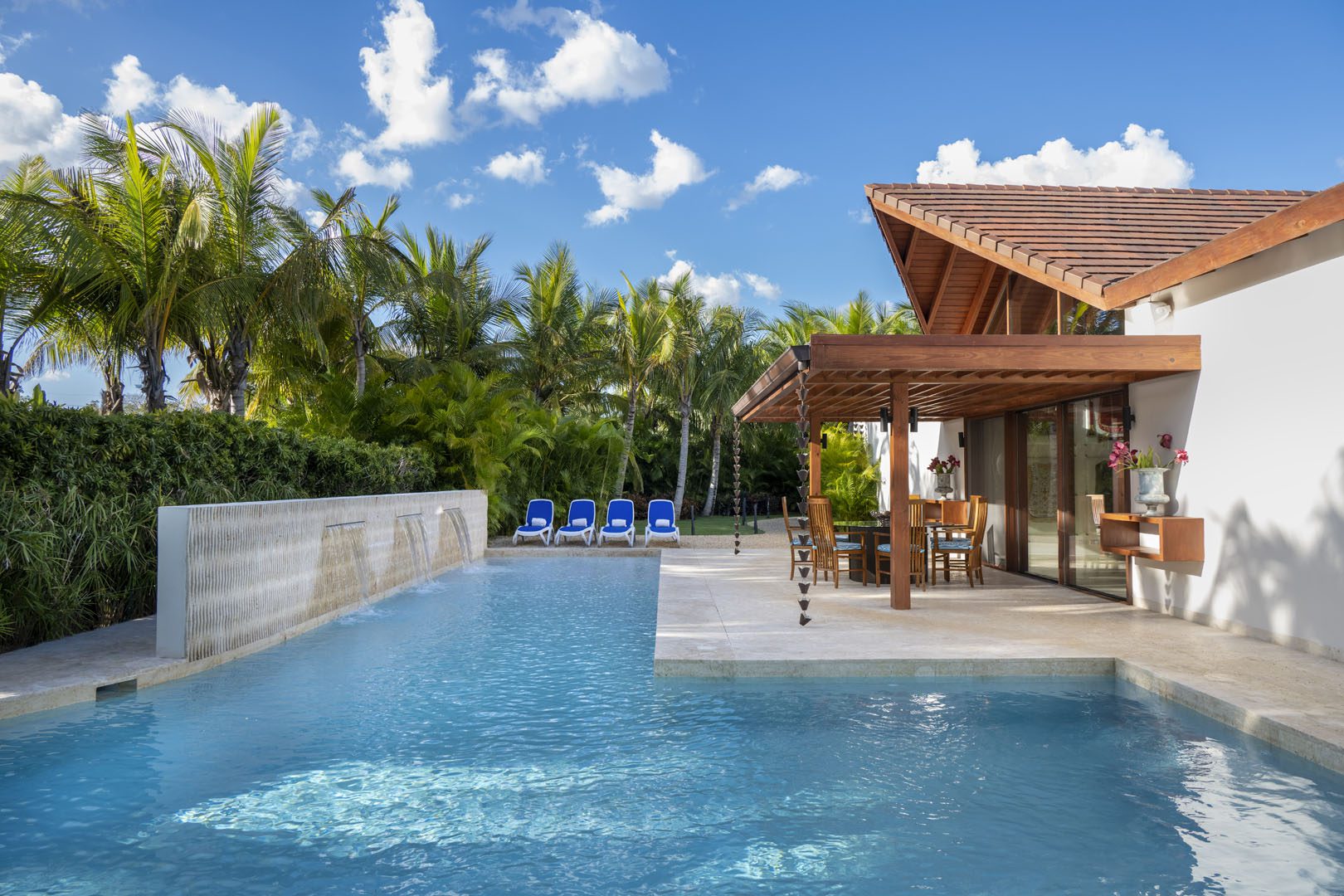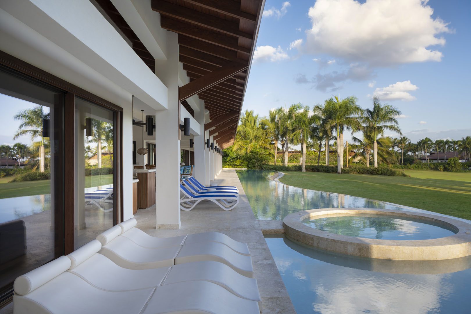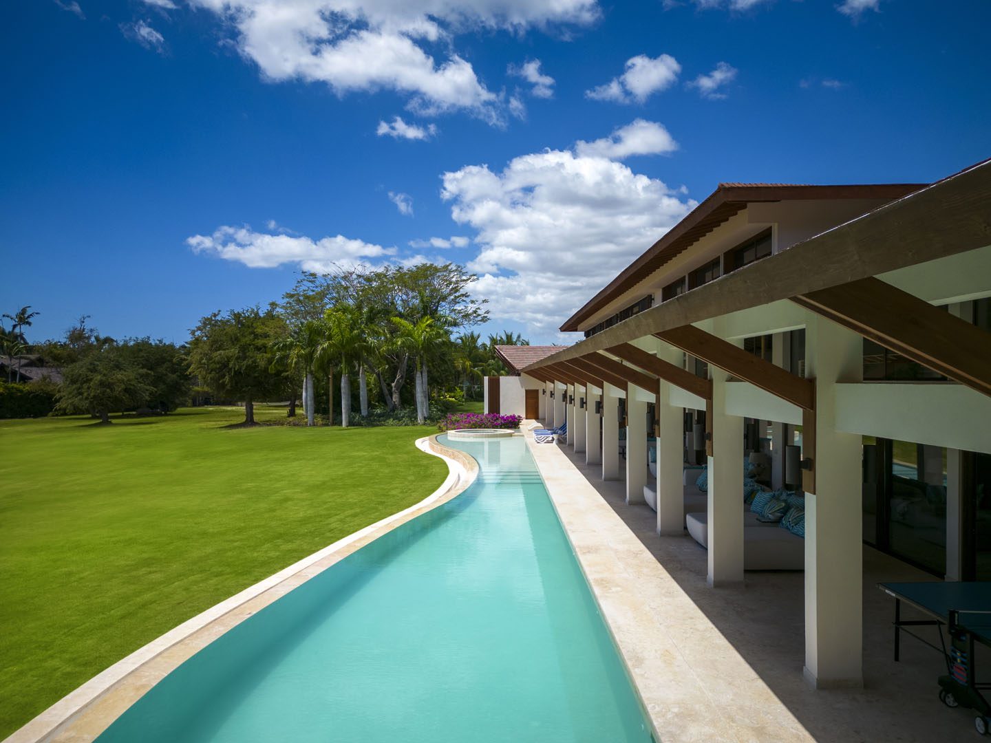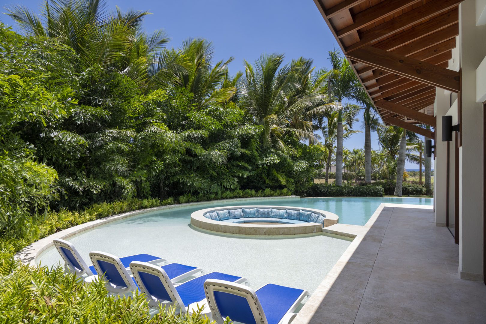 Villa El Descubrimiento is an architectural masterpiece that seamlessly combines lavish amenities and unparalelled design. With 3 floors connected by an elevator, the space provides convenience for every guest. Surprising details and quirky decor can be found in every corner, creating an ambiance both enchanting and welcoming. When it comes to entertainment, Villa El Descubrimiento offers the best alternatives for people of all ages and interests. Competitive folks can push their luck in the game room, choosing between air hockey, pool, or chess. Movie enthusiasts will be delighted by the indoor theater, equipped with cutting-edge audiovisual technology and comfortable chairs for a cinematic experience like no other. Three bars are strategically placed throughout the villa to ensure that refreshments are always within reach. On quieter days, the gym and yoga room provide opportunities for wellness, while a dedicated workstation caters to those who need to balance work and play during their stay. Two exclusive pools offer a refreshing respite, where you can relax overlooking the golf course and parts of the Caribbean sea. Villa El Descubrimiento promises an extravagant experience for people who love to discover hidden gems in the world of luxury accommodations.